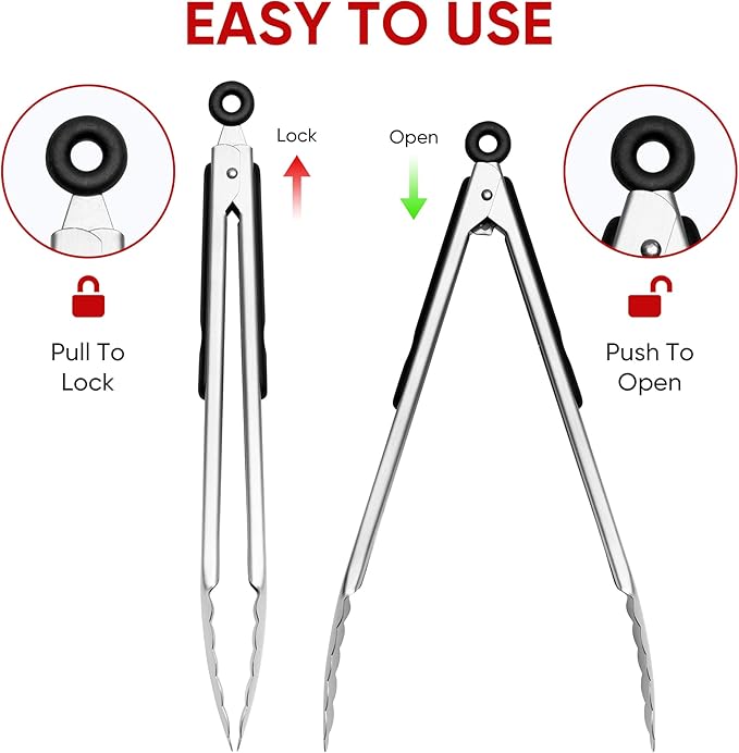 Anti-slip handle strips for secure grip. Food-grade stainless steel tips withstand temps over 600°F/315°C – no melting/warping.
